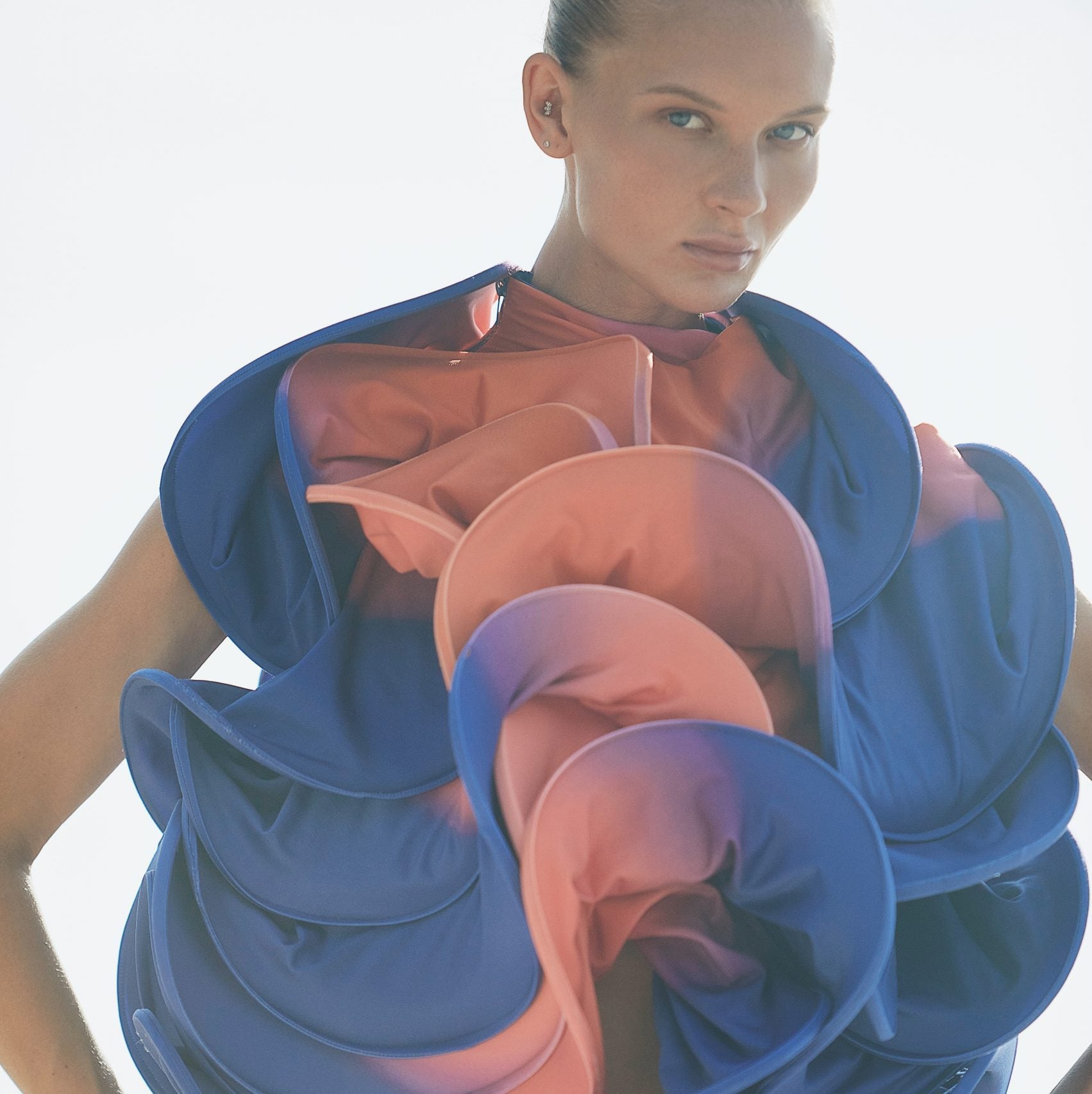 VESTIDO ASSIMÉTRICO CONCHAS MORADAS Y ROSA